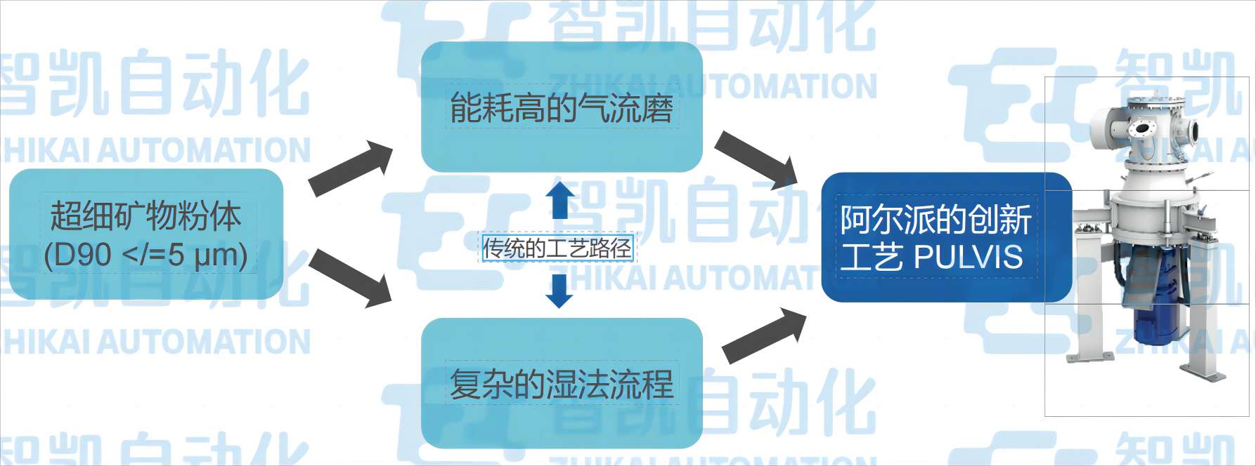 Pulvis是(shì)高(gāo)效節能(néng)的(de)超細幹法研磨機(jī)和(hé)集成分(fēn)級機(jī),研磨超細顆粒(亞微(wēi)米 d97 < 1μm)。