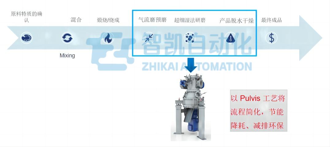 具體(tǐ)的(de)流程是(shì):在前端工(gōng)藝不(bù)變的(de)前提下(xià),直接用(yòng)Pulvis對(duì)煅燒後的(de)混合料進行(xíng)超細研磨,☆獲得(de)合格的(de)超細粉。省卻了(le)高(gāo)能(néng)耗的(de)氣流磨預磨、配漿•、加入研磨助劑、濕法砂磨、脫水(shuǐ)幹燥等環節。