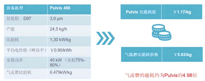 做(zuò)為(wèi)對(duì)比試驗的(de)氣流磨,相(xiàng)同的(de)物(wù)料研磨到(dào)同樣細度,能(néng)耗為(wèi)6.479¥kW/kg, 電(diàn)費(fèi)成本為(wèi)5.83元/kg, 為(wèi)Pulvis的(de)4.98倍。因此客戶在生(shē•ng)産中節約了(le)80%的(de)研磨能(néng)耗成本,産品更具市(shì)場(chǎng)競争力。